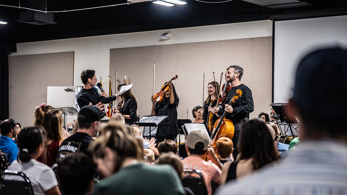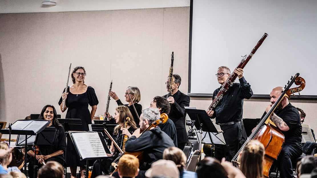 Conductor David Cubek started the concert by explaining the different groups of instruments in the Orchestra. The Strings, Woodwind, Brass and Percussion all stood and were cheered by the crowd. Then David explained which instrument represented which charachter in the story. The audience cheered for Peter and the strings and booed for the Wolf – represented by three very villianous French horns! After a quiz confirmed that the children present knew exactly which instrument and animal was which, the performance began.